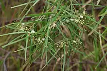 Acacia acrionastes is a species of flowering plant in the family Fabaceae and is endemic to eastern Australia. It is a spindly, glabrous shrub or tree with linear phyllodes, flowers arranged in a racemes with 10 to 15 spherical heads of flowers, each with 12 to 16 creamy yellow flowers, and leathery pods up to 10 mm (0.39 in) long.