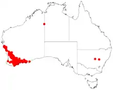 It is native to an area in the Mid West, Wheatbelt and the Great Southern regions of Western Australia.[1] It has a scattered distribution from Kalbarri in the north and then south around Carnamah. It occurs predominantly south from Carnamah to Stirling Range National Park in the south and east to around Grass Patch where it grows in clay, sand, sandy loam, gravelly loam and loamy soils and is usually part of mallee woodland and heath communities.[2]
