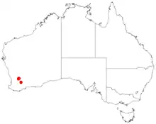 It is native to an area in the Wheatbelt region of Western Australia where it occurs among granite outcrops in pockets of soils.[2] It is only found in a few populations located between Kellerberrin and Kulin.[1]