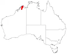 It is native to an area in the Kimberley region of Western Australia where it is found on ridges amongst rocks in areas of sandstone and quartzite.[1] The bulk of the population is found in the King Edward River district around the Kalumburu Mission where it is usually part of mixed woodland communities on ridges or on river banks in deep sand.[2]