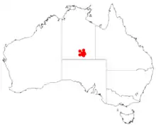 It is endemic to a small area among the plains and hills of the Rodinga Range, Train Hills and Pillar Range on Allambi Station and Todd River Station in the southern part of the Northern Territory to the south of Alice Springs where it is often situated along stony watercourses and in dry rocky gullies at the foot of the ranges and on rocky cliffs composed of sandstone.[4]