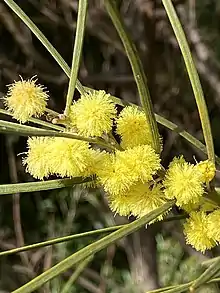 The shrub or small tree typically grows to a height of around 1 to 7 m (3 ft 3 in to 23 ft 0 in) and has an upright and open habit with hairy, yellow-ribbed angular branchlets. Like most species of Acacia it has phyllodes rather than true leaves. The glabrous, thinly coriaceous and evergreen phyllodes have a narrowly linear or occasionally linear-oblanceolate shape are usually mostly incurved. The phyllodes are 4 to 17 cm (1.6 to 6.7 in) in length and 1 to 7 mm (0.039 to 0.276 in) wide and have three raised distant nerves.[3] It blooms between July and October producing inflorescences that appear in groups of one to three, or sometimes as many as seven, on an axillary axis that is 1 to 15 mm (0.039 to 0.591 in) in length. Sometimes these will appear in the axils of the phyllodes. The spherical flower-heads have a diameter of 5 to 10 mm (0.20 to 0.39 in) and contain between 20 and 40 lemon yellow to bright yellow coloured flowers.[1] Following flowering it produces straight, thinly leathery to firmly papery, brittle seed pods that are flat but are raised over each of the seeds. The pods are 3 to 11.5 cm (1.2 to 4.5 in) in length and 3 to 5 mm (0.12 to 0.20 in) wide with sparsely distributed hairs.[1]