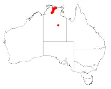 It is endemic to the top end of the Northern Territory where it is chiefly found in Arnhem Land, throughout Kakadu National Park and Nitmiluk National Park where it is often situated on plateaux and in gorges and on slopes growing in sandy soils usually near creeks or streams.[1]