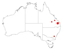 It is endemic to two small areas in the Burnett District of south east Queensland where it is often situated amongst outcrops of sandstone growing in sandy or in shallow, stony soils that have originated from basalt.[2] It is found in hilly terrain of differing slopes and aspects, in gullies, on plains and on hill crests. and grows well in disturbed ground and along roadsides.[1] It occurs in dense stands or as part of gun-tree woodland communities along with Eucalyptus crebra, Corymbia citriodora, Corymbia trachyphloia and Eucalyptus exserta.[1]
