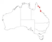 The shrub has a limited range in north Queensland from around Ingham including Hinchinbrook Island where it is not common. It is usually found along watercourses as a part of open Eucalypt woodland communities growing in sandy soils.[2]