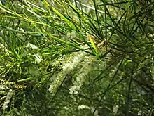 The wattle is slender shrub or small and spreading tree that grows to a height of about 5 m (16 ft). It has dry and membranous stipules that are usually less than 0.5 mm (0.020 in) in length. Like most species of Acacia it has phyllodes rather than true leaves. The thin and dark green phyllodes have a linear and are usually straight with a length of 6 to 18 cm (2.4 to 7.1 in) and a width of 1 to 10 mm (0.039 to 0.394 in) with three to seven main veins with the midvein that is most prominent. It blooms between January and May and fruits around November.[2]