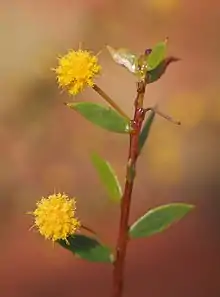 The shrub has an open and spindly habit, with a height of 0.7 to 3.0 metres (2 to 10 ft).[2] The resinous and glabrous branchlets are generally terete in form. The glabrous phyllodes are straight with a narrowly elliptic shape and are 0.8 to 2.5 centimetres (0.31 to 0.98 in) in length and 1 to 3 millimetres (0.039 to 0.118 in) wide.[3] Flowers are yellow and occur sometime between May and October.[2] The simple inflorescences occur singly in the axil of the phyllodes. The globose flower heads with a diameter of 4 to 5 mm (0.157 to 0.197 in) and contain 35 to 60 bright yellow flowers. Following flowering smooth papery seed pods form. The pods are straight and slightly constricted between seeds with a length of 4 to 5 cm (1.57 to 1.97 in) and 3 to 4 mm (0.118 to 0.157 in) wide.[3]