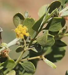 It grows as a resinous, multi-stemmed shrub or small tree, 0.6 to 7 metres (2 to 23 ft) in height, with grey or reddish-brown minni ritchi bark.[1] The plant normally has a V shaped form with an openly branched spreading crown at times with sparse foliage present. The evergreen phyllodes have an elliptic to obovate shape and are slightly asymmetrical. The blade is 10 to 32 millimetres (0.39 to 1.26 in) in length and 5 to 20 millimetres (0.20 to 0.79 in) wide and has three to five main longitudinal nerves.[2] It produces yellow flowers from April to August.[1] The simple inflorescences have fragrant, globular to obloid or occasionally shortly cylindrically shaped flower heads that are 10 to 20 mm (0.39 to 0.79 in) in length with light golden flowers. The flowers are not very densely packed in the heads and are relatively large in size. The leathery seed pods that form following flowering are brown in colour and slightly shiny. Each pod has a narrowly oblong shape and is mostly flat but raised over the seeds. The pods are 2 to 10 cm (0.8 to 3.9 in) in length and 7 to 15 mm (0.28 to 0.59 in) wide, they are sticky with resin and have a sweetly aromatic smell. The shiny deep brown seeds within the pods have an obloid-ellipsoidal shape and are 4 to 6 mm (0.157 to 0.236 in) in length and 3 to 4 mm (0.118 to 0.157 in) wide.[2]