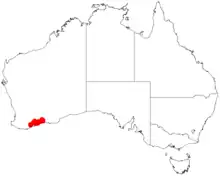 It is native to an area in the Great Southern and Goldfields-Esperance regions of Western Australia where it is commonly situated on undulating plains and on lateritic rises growing in gravelly sandy, sandy-clay or loamy soils.[1] The range of the plant extends from the Fitzgerald River in the west to around the Young River in the east with outlying populations found near Boxwood Hill further to the west. It is usually found as a part of dense low heath, open mallee and open dwarf scrubland communities.[2]