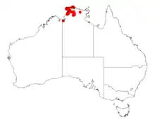 It is found in north western parts of the Northern Territory including on Melville Island to the north and down to around Katherine in the south where it is found growing in gravelly lateritic soils with a scattered distribution amongst open woodland and forest communities.[1]