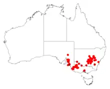 It is endemic to south eastern New South Wales, northern Victoria and south eastern South Australia. In New South Wales the range of the plant is mainly between West Wyalong, Condobolin and Forbes where it is usually found growing in red earth soils as a part of mallee communities.[1] In Victoria it is found in the Lowan Mallee, Murray Mallee and Wimmera regions where it found near water sources growing in red earth or clay soils. It is considered to be a vulnerable species in Victoria[3] It is considered to be rare in South Australia and is confined the south eastern part of the state to the south-west of Naracoorte growing in dark coloured but shallow cracking clays.[4]