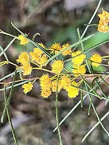 The rounded shrub typically grows to a height of 0.3 to 3 metres (1 to 10 ft)[1] and has cylindrical, weakly angled and glabrous to hairy branchlets. Like most species of Acacia it has phyllodes rather than true leaves. The evergreen phyllodes are straight to slightly curved with a length of 1 to 3.5 cm (0.39 to 1.38 in) and have a diameter of 0.7 to 1.5 mm (0.028 to 0.059 in) and have eight distant raised to plane nerves.[2] It blooms from August to October and produces yellow flowers.[1] The simple inflorescences occur in pairs in the axils and have spherical flower-heads with a diameter of 2.8 to 4.5 mm (0.11 to 0.18 in) containing 16 to 30 golden coloured flowers. Glabrous and thinly crustaceous seed pods form after flowering that have a linear shape but are slightly raised over and constricted between each of the seeds. The pods have a length of about 4 to 5 cm (1.6 to 2.0 in) and a width og 2.5 to 3.5 mm (0.098 to 0.138 in) and contain subglossy mottled blackish coloured seeds that have an elliptic or oblong-elliptic shape and are 2.5 to 3.5 mm (0.098 to 0.138 in) in length and have a crested aril.[2]
