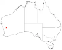The species is found in a small area near Perenjori in the Mid West region of Western Australia. It grows red silt and thin sands over red ironstone and laterite on crests and ridges of ranges.[2] Only three populations in the Blue Hill Range are known. Each population is within 1 to 5 kilometres (0.6 to 3.1 mi) of the next and covers an area of around 40 square kilometres (15 sq mi) in total. The species is mostly found in tall shrubland communities or thickets dominated by other Acacia species, Allocasuarina acutivalvis or Eucalyptus petraea[1]