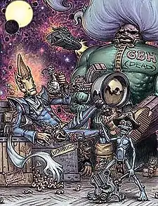 Other recurring characters were Jago Kain, the human boss of Ace's business rival Yellow Line, Cap'n Evil Blood, a space pirate who was always trying to kill Garp, Ace-hating officers Kroxley and Zagger of the Galactic Police and Fatty Arkl, a rotund alien who ended up as the skipper of Ace's second ship (Old Peart The Third).