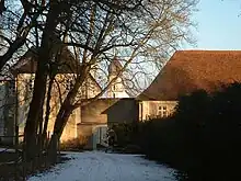 Achstetten Castle is a spacious three-storey building in classicist style with a risalit in its centre.[2] Two wings are loosely attached to the main structure at a right angle. These two wings function as economy buildings. On three sides the castle is surrounded by a large park, which is home to an enclosure where fallow deer are kept.[3] The main access to the castle is by a driveway measuring about 150 metres (490 ft) long. Noteworthy of the interior are a classicist staircase, 19th century furniture, an iron stove from 1798, portraits of the Freyberg family and a porcelain collection.[4] A raised and roofed passageway on wooden pillars connects the castle to the nearby church.[5] This passageway has a length of approximately 100 metres (330 ft).[6] Passageways of this kind, which enabled the lord of the castle and his family to enter the church without being subject to the weather, were not uncommon; remnants of such a construction can also be seen at Großlaupheim Castle.[7]