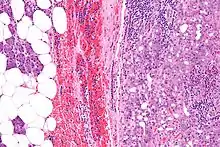 | Micrograph of an acinic cell carcinoma (right of image) and acinar glands (parotid gland - left of image). H&E stain. | |