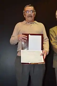 His first exhibition was at the Chalco Cultural Center, which he admits scared him to present his work to artists and intellectuals.[2] He has since exhibited in various museums and other cultural institutions as both artist and artisan in the State of Mexico and Mexico City,[5] and has exhibited in various Mexican universities.[1] His first and only major international exhibition of his work was in the United States, although he has sent pieces to Italy, France, Brazil and South Korea.[6][7][8] In 2014, he exhibited at the Museo de Arte Popular for the first time as a "grand master."[1]