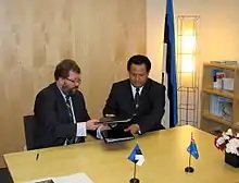 ![]() Estonian Ambassador to the United Nations Margus Kolga (left) signs diplomatic relations with the Tuvaluan Ambassador to the United Nations, Afelee F. Pita (right). 25 May 2011. | |