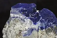 Afghanite, (Na,K)22Ca10[Si24Al24O96](SO4)6Cl6,[2] is a hydrous sodium, calcium, potassium, sulfate, chloride, carbonate alumino-silicate mineral. Afghanite is a feldspathoid of the cancrinite group and typically occurs with sodalite group minerals. It forms blue to colorless, typically massive crystals in the trigonal crystal system. The lowering of the symmetry from typical (for cancrinite group) hexagonal one is due to ordering of Si and Al.[2] It has a Mohs hardness of 5.5 to 6 and a specific gravity of 2.55 to 2.65. It has refractive index values of nω = 1.523 and nε = 1.529. It has one direction of perfect cleavage and exhibits conchoidal fracture.[4] It fluoresces a bright orange.
