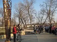 Community members perform in front of the public art piece 'Trumpet' at the 2008 Martin Luther King Jr. Memorial Celebration