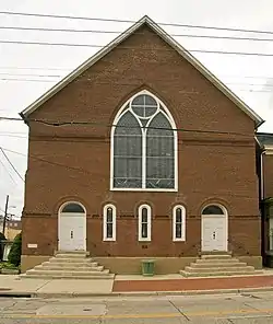 The African Methodist Episcopal Church in Cumberland, Allegany County, Maryland, was built in 1892 to replace a previous church which the congregation had outgrown. The congregation was founded in 1847 by a group of African-American Methodists who had previously worshiped from the balcony of the Centre Street Methodist Episcopal Church. The first church was built in 1848, then rebuilt and enlarged in 1871 and again in 1875.