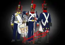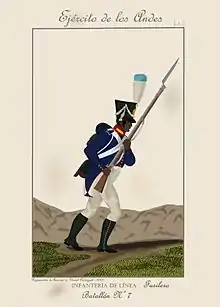 The number of black soldiers in the Andean army of San Martín during the liberation of Chile from the Spanish throne[15] was numerous and the majority of soldiers from the regiments called numbers 7, 8 and 11 of the Andes infantry were grouped together, but in said regiments all the officers and non-commissioned officers they had to be white according to Argentine law, although San Martín wanted to change the rules so that at least black soldiers would reach the ranks of corporals and sergeants. However, traditionally the Spanish colonial army had battalions of blacks divided into slave and free castes, and San Martín believed it even more difficult to gather people of color and whites fighting as a troop in the same unit. Later both groups numbers 7 and 8 will be recast in Peru in the black regiment of Río de la Plata. The number 4 of Chile, initially white Creoles, will also be converted by his slave recruit from Peru into a black regiment.[16] So the origin of the recruit of people of color was geographically diverse, and consisted of black slaves or freedmen (whether they are Africans or Creole blacks), and in addition to free castes, called in the colony pardos and morenos.