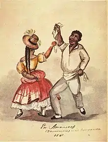 Another etymological analysis indicates that it would go back to the musical forms belonging to the Gypsy-Andalusian tradition brought by the Spaniards to Chile,[29][30] which would have its antecedents in the Moorish element of the zambra[31] (From the Hispanic Arabic zámra, and this from the classical Arabic zamr, 'tocata').[32] Although possible, it is important to know that other dances such as the Zamba in Bolivia and Samba in Brazil have their origins in the Kimbundu and Kikongo languages as well.[33]