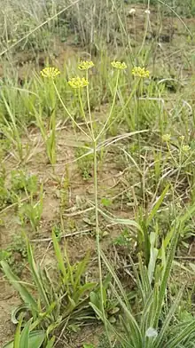 Afrosciadium magalismontanum is a member of the carrot family, Apiaceae. It is a perennial tuberous herb native to subtropical regions in eastern South Africa (Free State, KwaZulu-Natal, and Northern Provinces) and Eswatini.[2][1] It has a tall, narrow stem which divides into multiple evenly-spaced branches near the top, with each branch sporting a cluster of small yellow flowers at its end.