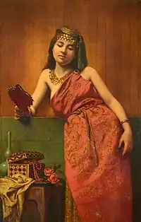 Agapit Stevens painted glamorous women in interiors, genre scenes, landscapes, seascapes, still lifes and Orientalist scenes depicting odalisques, dancers and harem musicians.[1] His Orientalist paintings appear to be studio works rather than the product of a visit to the Orient.[5]