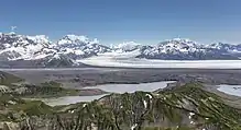 ![]() Malaspina Glacier is a compound glacier, formed by the merger of several valley glaciers, the most prominent of which seen here are Agassiz Glacier (left) and Seward Glacier (right). | |