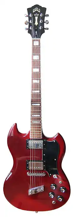 Cosey played a Guild S-100 electric guitar and heavily employed chromaticism, dissonance, and feedback in his improvisations on Agharta.[43] He alternated between several effects pedals set up underneath his table of percussion instruments, including a fuzzbox for distorting guitar sounds and two different wah-wah pedals he used during solos or when playing more mellow tones.[44] Cosey often arranged his guitar strings in different places on the fretboard and never played in standard tuning, using at least 36 different tuning systems, each of which altered the style and sound of his playing.[45] According to Tzvi Gluckin from Premier Guitar, his experimental guitar playing was rooted in the blues and displayed a sense of phrasing that was aggressive and "blistering" yet "somehow also restrained", particularly in his control of feedback.[44]