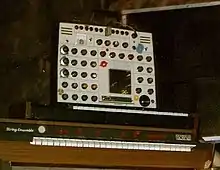 The rhythmic direction of the music was occasionally interrupted by densely layered percussive and electronic effects, including repeated whirring and grinding sounds. Cosey generated these sounds by running his guitar through a ring modulator and an EMS Synthi A.[37] The latter device was an early synthesizer with knobs and buttons but no keyboard, making it useful for producing abstract noises rather than exact pitches and melodies. While serving as an effects unit for his improvisations, it was also used by Cosey to suggest a certain soundscape during each performance. "Whether we were in space, or underwater or a group of Africans playing – just different soundscapes", he later explained.[38]