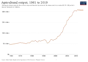 Imperial government policy permitting investors to import fertilizers, pesticides, tractors and combines, and (until 1973) fuel free of import duties encouraged the rapid expansion of large-scale commercial farming. As a result, agriculture continued to grow, albeit below the population growth rate. According to the World Bank, agricultural production increased at an average annual rate of 2.1 percent between 1965 and 1973, while population increased at an average annual rate of 2.6 percent during the same period.[8]