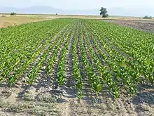 North Macedonia possesses 10,140 km² of agricultural land, which is almost 39% of its territory. Half of this land is devoted to crop growing, and the other half livestock farming. The country has 48,606.75 hectares of forests.[17] Macedonia distinguishes itself by the smallness of its agricultural properties: 80% of them are between 2.5 and 2.8 hectares, and are divided into small parcels. The former state-owned businesses, which are much bigger, are generally in financial difficulties due to incomplete privatisations.[2]