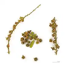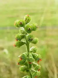The flowers with their abundant pollen supply attract hoverflies, flies and honey bees. They also are an important food source for butterflies like the grizzled skipper.[8] The pollinated flowers develop fruits with burs. These attach to passing grazing animals such as cattle, sheep and deer and are spread over a large area.[2] Agrimony is found usually in young grasslands, less than 50 years old.[9] It is a wild host for a few insect pest species (Stigmella fragariella and Coroebus elatus) that feed on loganberries, raspberries, and strawberries in Europe.[10]