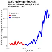 The trust was one of 26 responsible for half of the national growth in patients waiting more than four hours in accident and emergency over the 2014/5 winter.[18] The trust was well below target for seeing A&E patients promptly, it was slightly below target for planned operations and care but was above target for cancer care.[19]