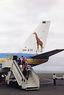 Air Tanzania was relaunched in September 2007 with two leased Boeing 737-200s in its fleet. The new brand represented the company's name, Mount Kilimanjaro and the airline's international destinations. The introduction of the airline's new logo on a leased Airbus A320 bore the image of the imposing giraffe – Tanzania's national icon, to replace the South African Airways flag symbol.[32][33] On 1 October 2007, the revamped Air Tanzania made its inaugural flight on the Dar es Salaam to Mwanza via Kilimanjaro route.[34]