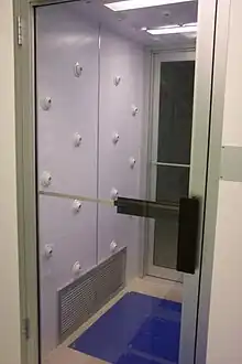 Air showers are generally constructed from cleanroom-compatible steel or plastic materials and feature electronically-powered blowers, filters and high-pressure jet nozzles, the latter being incorporated into the walls and ceiling of the chamber.[3] Air, at velocities of 3,000 ft/min (15 m/s) to 7,000 ft/min (36 m/s), continuously streams from the jet nozzles for 30–45 seconds, effectively removing loose particulate matter.[4] Personnel inside the enclosure will lift their arms and turn their bodies for uniform exposure to the air streams, a procedure usually specified in protocol. Air currents from the jets create shearing and flapping forces, which lift and remove contaminants from both flat surfaces and the creases of garments.[4] HEPA filtration within the air shower is capable of removing 99.97% of particles greater than 0.3 µm diameter.[5]