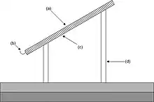 Diagram of a radiative collector. (a) radiating/condensing surface, (b) collecting gutter, (c) backing insulation, (d) stand.