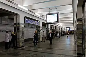Designed by architects A.Zenzin and M.Pirogov, the station is a typical pillar-trispan consisting of two rows of concrete pillars, which are revetted with grey marble, and punctuated by stainless steel insets. In addition the station features contrasting white marbled walls and grey granite floor. Both vestibules have large artworks (work of V.Churilo and S.Sokolov).