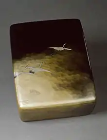 Box for Documents and Papers (ryoshi bako) with Cranes in Flight, Akatsuka Jitoku, c. 1904, lacquer, gold and silver. In the collection of the Walters Art Museum.