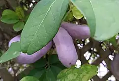 9. 1 2 Yamagata City Health Center (2011-01-31). "あけびの詰め物" [stuffed akebia]. Archived from the original on 19 October 2011. Retrieved 31 January 2017., photograph shows trifoliate variety (twig, fresh purple plant, and prepared dish)