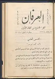 Al-ʿIrfān was founded in Beirut by Aḥmad ʿĀrif az-Zain (1883-1960) in 1909.[1] From 1910 the publication was transferred to a special printing house in Saida, South Lebanon. Az-Zain, who had worked before for different magazines, among others Thamarāt al Funūn (1875-1908), was in charge until 1960. Together with Aḥmad Riḍā (1872-1953) and Sulaimān Ẓāhir (1873-1960) he initiated a new stage of Nahda with this encyclopedic educational journal in South Lebanon.[2][3]