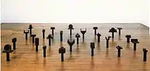 Kirili simultaneously presented a group of new "sculptures-tables", table like sculptures, entitled Générations.[34] Initiated in 1984, Générations as Kirk Varnedoe suggested "brings together a complex array of individual smaller sculptures – pieces from the 'Commandment' series, and forged-iron works of various scales" in an approach of "formal unity". Générations with their "lively tempo and bright openness" explore a dialogue between heterogeneous forms and media, between variety and unity.[35]