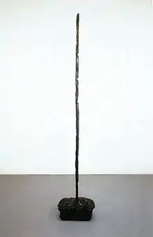 Messager, 1976, is one of Kirili's earliest forged iron pieces; it consists in a thinly shaped iron bar growing out of its base in modeled bronze.[19] The tactile and spiritual quality of the sculpture distinguishes it from then-prevailing tendencies in Conceptual art. Art historian Robert Rosenblum perceived in this work a vertical force, familiar in the paintings of Barnett Newman, suggesting "a spiritually rather than materially assertive human presence".[20]