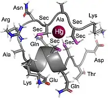 Binding site of mercury (Hg) in selenoprotein P of grebe bird.[22][23]