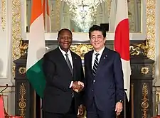 Shinzo Abe with Alassane Ouattara at the Guest House Akasaka Palace in 2019