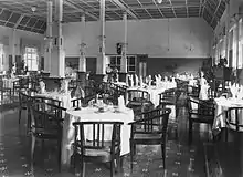 The DENIS bank design was highly appreciated after which their office received another contract in 1936 to redesign the famous hotel in Bandung, the Savoy Homann Hotel. The hotel was built in 1880 and had been the major accommodation for the wealthy. F Van Es Jr., the hotel owner, asked Aalbers to renovate the hotel with a similar elastic impression as in the DENIS bank. The ocean wave facade and the vertical tower in the middle thus decorate the hotel's exterior, while Aalbers kept the colonial classical style for the interior. The hotel was reopened in 1939 and became internationally renowned. Several Hollywood artists have stayed in the hotel, including Charlie Chaplin and Mary Pickford.[3]