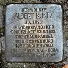 Albert Kuntz (December 4, 1896 – January 22, 1945) was a German goldsmith, soldier, communist and concentration camp victim. A soldier in the First World War, Kuntz rose to become an elected representative of the German Communist Party in Berlin's Prussian Landtag. In 1933 he was arrested by the Gestapo, and sent to a succession of prisons and concentration camps. He died in January 1945 at the Mittelbau-Dora concentration camp, where he had been organizing the sabotage of the V-2 rocket production line. Following his death, he was revered as an anti-fascist hero in East Germany.