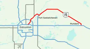Alberta Provincial Highway No. 15, commonly referred to as Highway 15, or Manning Drive within Edmonton, is a highway in the Edmonton Region of Alberta, connecting northeast Edmonton to the City of Fort Saskatchewan and communities within Lamont County. It serves as an alternative to Highway 16 that bypasses Elk Island National Park. The highway follows the route of a railway line completed in 1905 by the Canadian Northern Railway. In Edmonton, the most southerly portion of the route is named Fort Road, followed by Manning Drive to the north, a developing freeway.